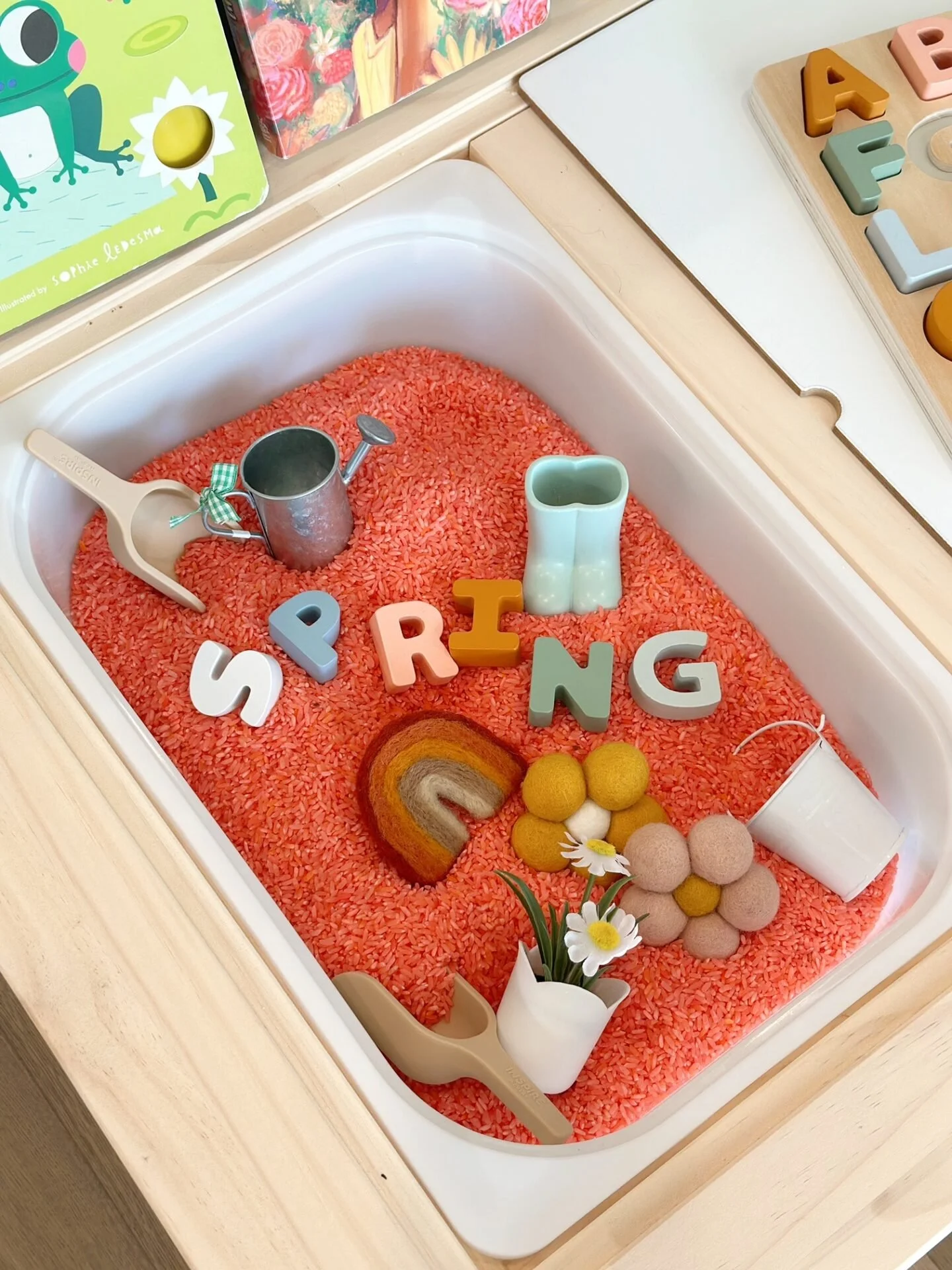 The Spring bin has cute felt flowers, pink-dyed rice, rainbows, scoops, a watering can, and more. It’s simple, but so effective. Check out www.styldgrace.com- they have so many great examples of sensory bins and they are so cute!